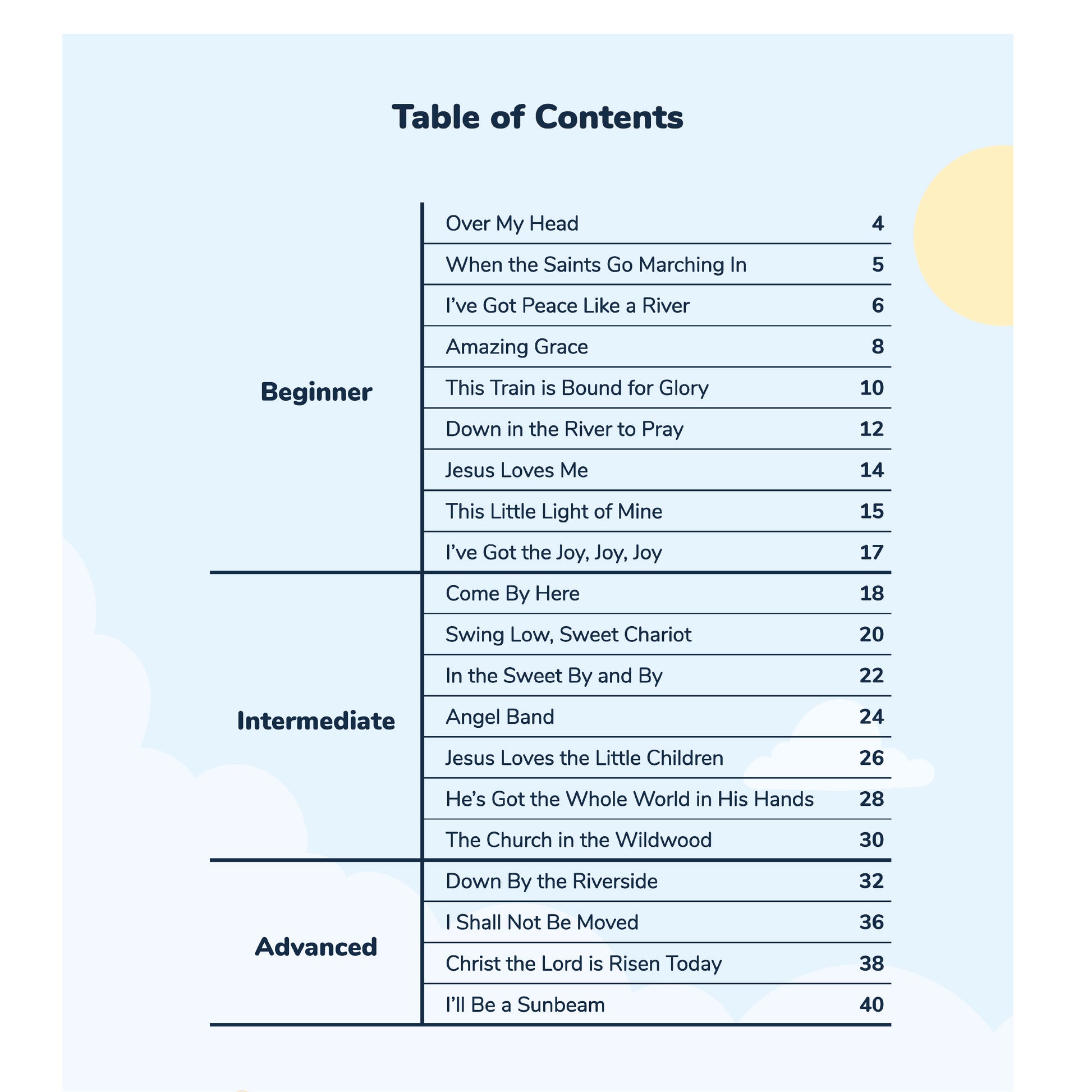 Inside you'll find 20 colorful arrangements celebrating Gospel and Old Testament songs like "This Train is Bound For Glory," "Amazing Grace" & "In the Sweet By and By" as well as more contemporary Sunday School favorites like "Jesus Loves Me," "Peace Like a River," & "Jesus Loves the Little Children."